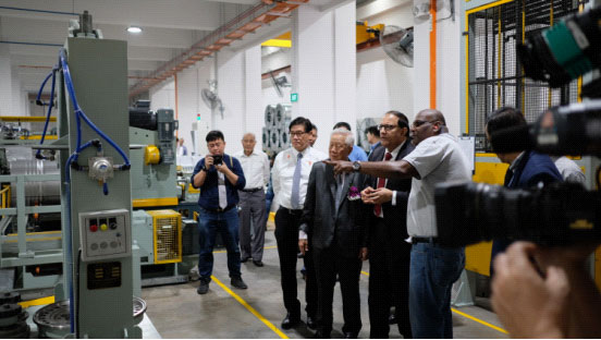 ▲圖3:新加坡貿(mào)易部長易華仁先生參觀工廠內(nèi)由北方制桶設(shè)備提供的全套鋼桶生產(chǎn)線