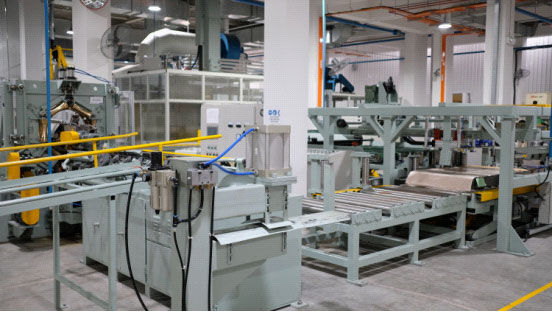 全套生產(chǎn)線生產(chǎn)節(jié)拍可達(dá)10只桶/分鐘。提供的設(shè)備包括前段數(shù)控開卷矯平錯位沖壓線、全自動連線雙鎖預(yù)卷生產(chǎn)線、變頻全自動鋼桶縫焊機及上料切寬系統(tǒng)、高速中段鋼桶設(shè)備、立式設(shè)備、鋼桶品質(zhì)檢測設(shè)備、步進式高速外涂噴漆房、底蓋內(nèi)噴漆房、桶身內(nèi)噴漆房、外涂烘干線及風(fēng)冷設(shè)備、內(nèi)涂烘干線及風(fēng)冷設(shè)備、升降機、絲網(wǎng)印刷機、旋轉(zhuǎn)式噴碼機、配套的輸送系統(tǒng)以及配套的工廠基礎(chǔ)輔助設(shè)備等。